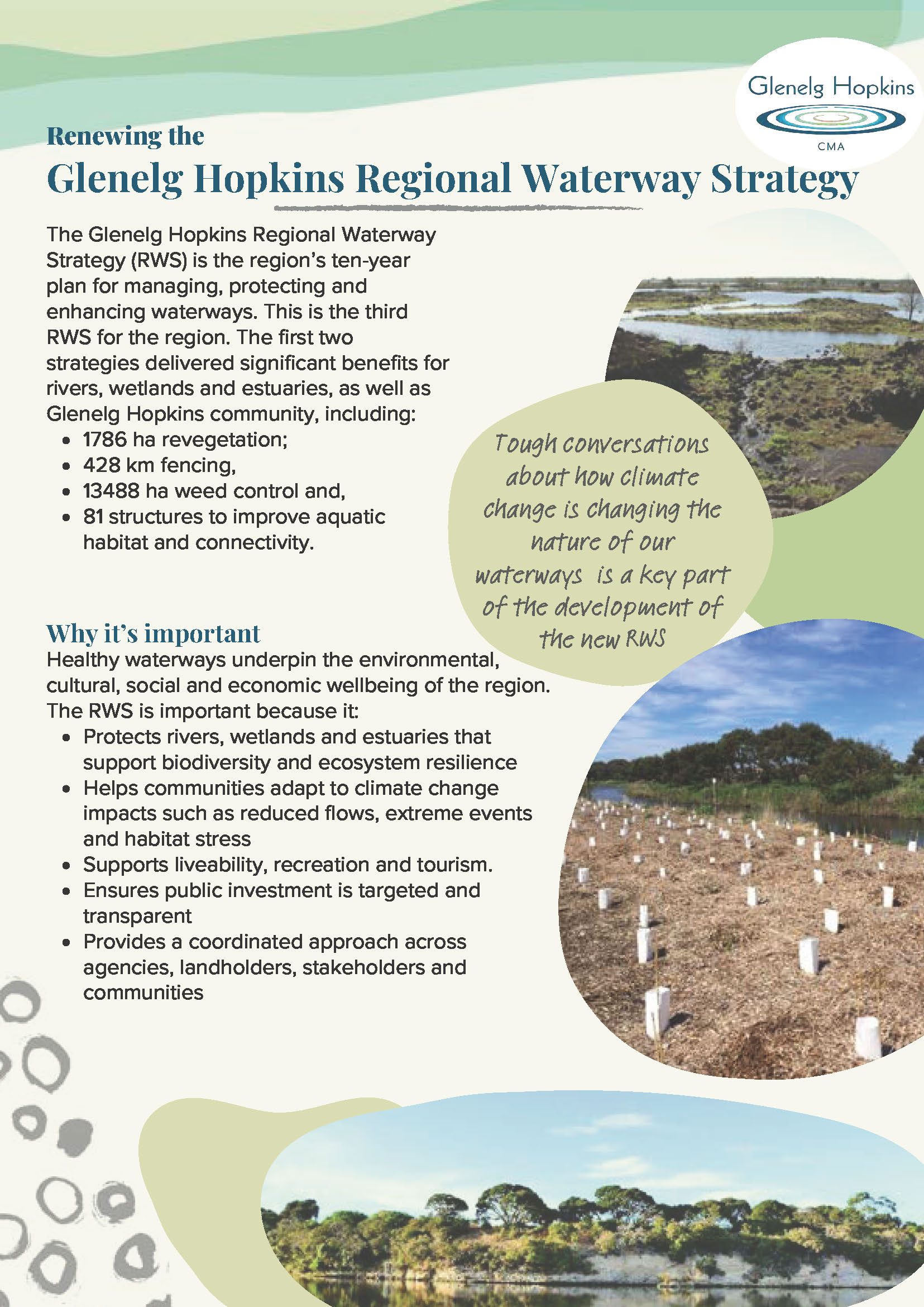 The Glenelg Hopkins Regional Waterway Strategy (RWS) is the region’s ten-year plan for managing, protecting and enhancing waterways.