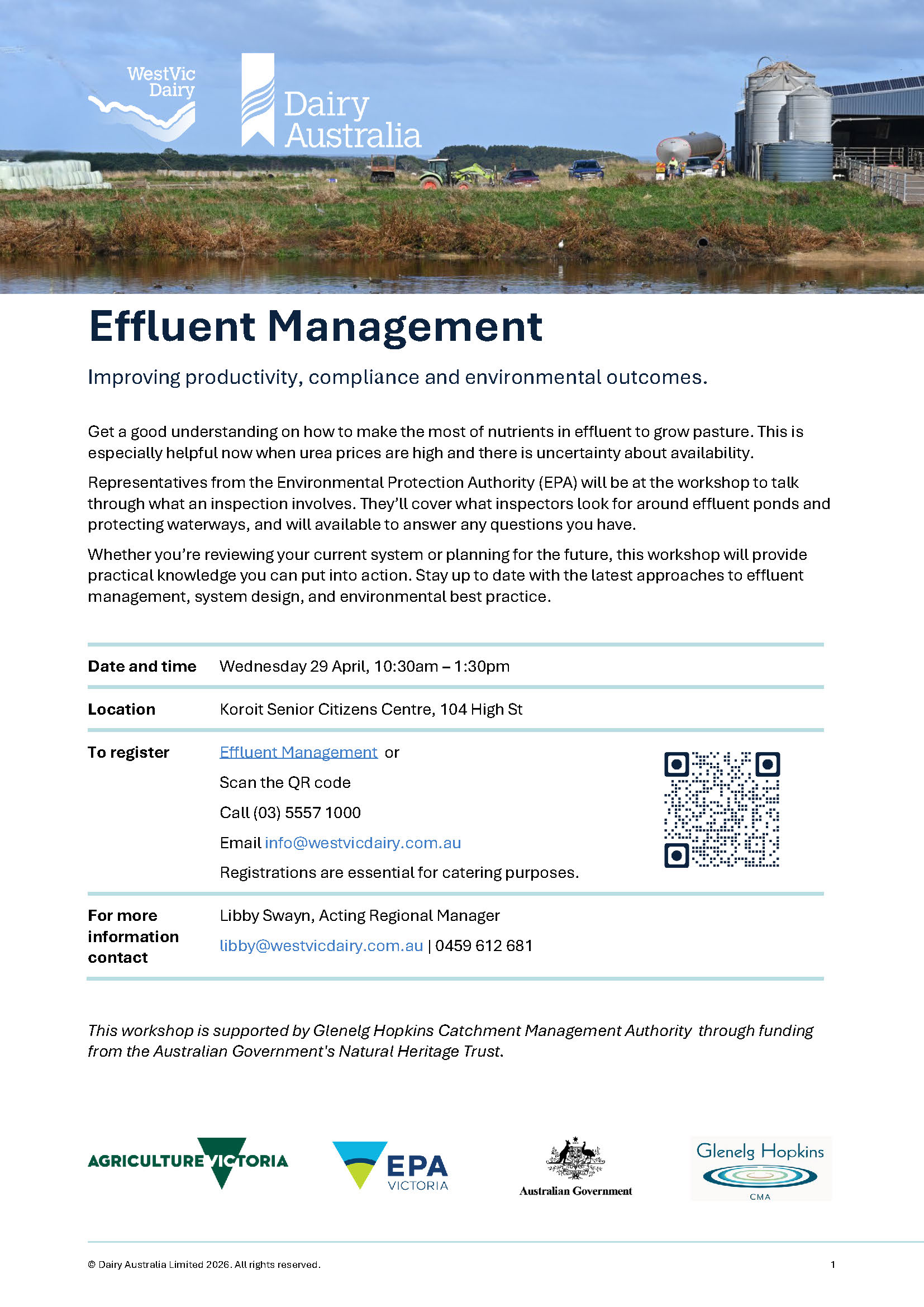 Improving productivity, compliance and environmental outcomes by managing effluent on dairy properties correctly while also making the most of them are key messages for farmers at a workshop in Koroit next week (April 29).